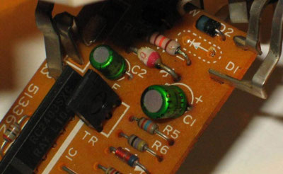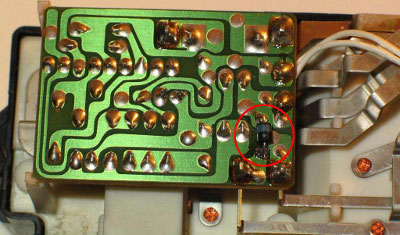 Be careful when soldering so that you do not burn the other components. You can solder the diode on the "correct" side of the board, but that is harder and does not work any better than doing it on the back-side (the easy side) as shown in the pictures.