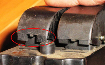 Take the control piece back to your working area. The first change will be to allow the switch to physically reach the auto-up position (it's one step farther up than the normal "hold to make it go up" position). There are two plastic tabs (ignore the middle piece) on the back (hinge-side) of the switch. If you pull back each switch, you will see that the passenger side can come up farther. Cut about 1.5mm from the tabs and try the switch again. If you hear it click, it should be good.